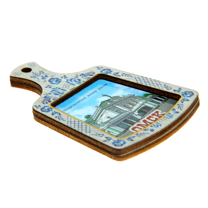Магнит в форме кухонной доски изготовлен в России из натурального материала — дерева. На магните изображён Академический театр драмы — это один из самых старых драматических театров во всей Сибири, причём появился он за счёт пожертвований простых горожан. В 1898 году был объявлен конкурс на проект здания нового театра, в котором победила работа инженера Хворинова. В 1915 году было выстроено новое здание театра. В его ниши установили бюсты Толстого и Чехова, а на фронтоне поместили скульптуру «Крылатый Гений» авторства Владимира Винклера.