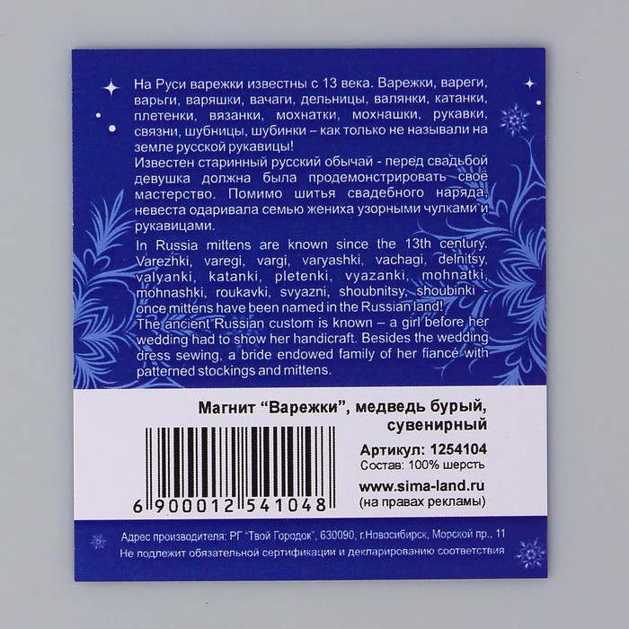 Магнит-варежка "Медведь бурый" — сувенир в полном смысле этого слова. И главная его задача — хранить воспоминание о месте, где вы побывали, или о том человеке, который подарил данный предмет. Преподнесите эту вещь своему другу, и она станет достойным украшением его дома.