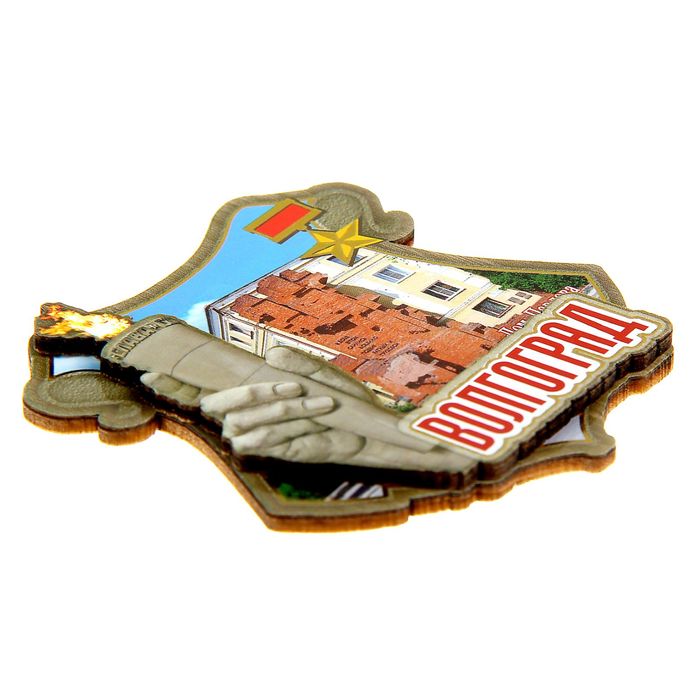 Роскошный и необычный магнит в форме щита изготовлен из дерева. На сувенире изображены два главных символа Волгограда: Дом солдатской славы и рука, держащая факел.