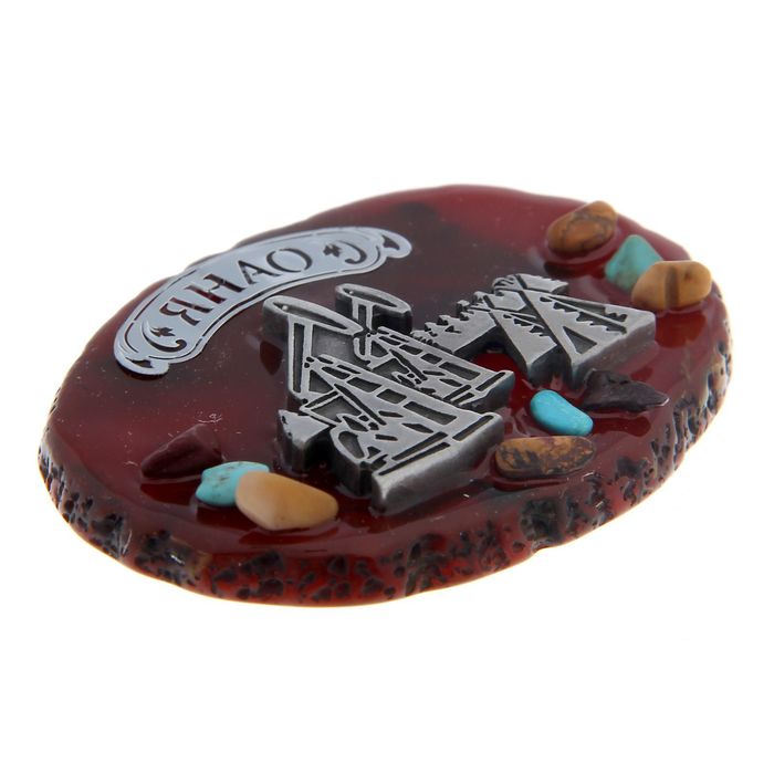 Магнит "ЯНАО" с россыпью натуральных камней состоит из акриловой подставки под малахит и металлической фигурки нефтяных вышек.