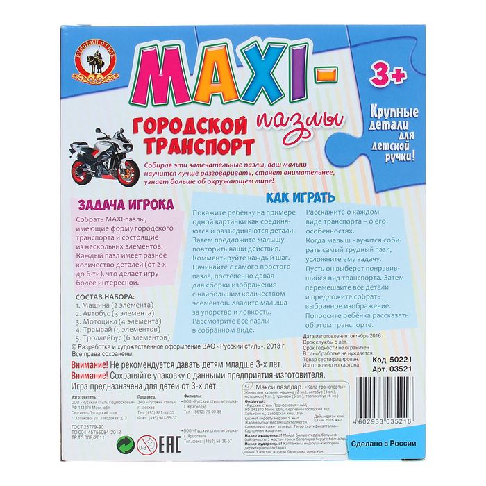 Пазл представляет собой игру-головоломку, в которой необходимо составить картинку из большого количества фрагментов. Сборка такой мозаики не потеряла свою популярность благодаря разнообразию её видов и изображений. Макси-пазлы «Городской транспорт» поможет с пользой провести досуг, а также поспособствует развитию цветового восприятия, логического мышления и мелкой моторики.