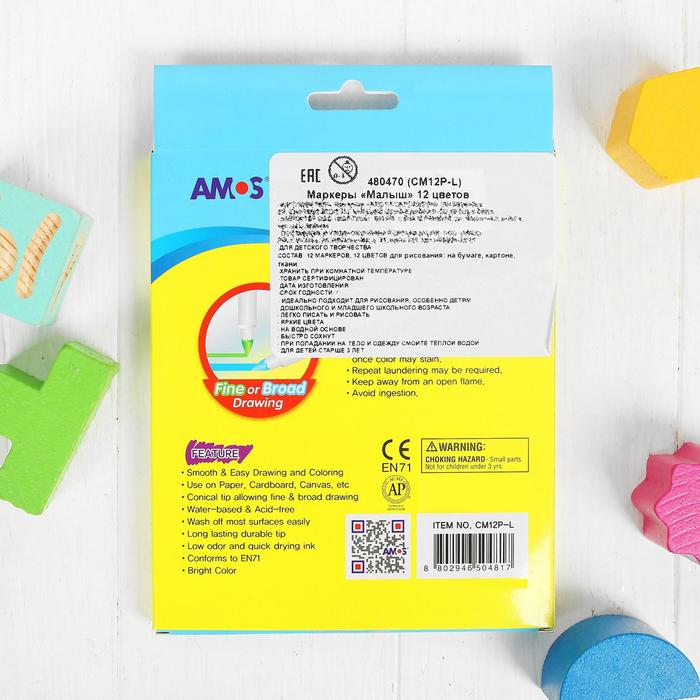Маркеры смывающиеся водой "Малыш", 12 цветов