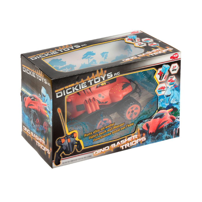 Радиоуправляемая машина-амфибия Dino Basher Triops создана специально для путешествий в мире юрского периода. Её корпус замаскирован под щитня, чтобы скрытно пробираться через стаи хищников. Вся электроника герметично защищена от попадания влаги, что позволяет спокойно преодолевать лужи в непроходимых тропиках.