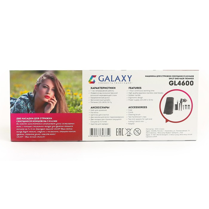 Мы предлагаем широкий ассортимент бытовой электроники. Машинка для стрижки секущихся концов Galaxy GL 4600, две насадки 3 и 6мм, 220 В — это полезный и актуальный прибор, который прослужит долго и сделает вашу жизнь проще.