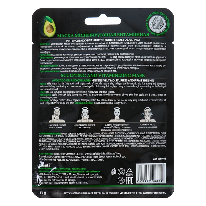 Маска для лица Vilenta "Моделирующая. Витаминная" c маслом авокадо и коллагеном, 28 мл