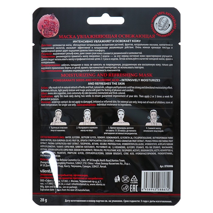 Маска для лица Vilenta "Увлажняющая. Освежающая" c экстрактом гранатовых косточек, 28 мл