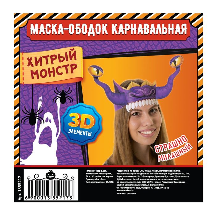 Маска-ободок "Монстрик" — незаменимый атрибут самой страшной ночи в году или костюмированной вечеринки. С таким аксессуаром вас точно заметят!