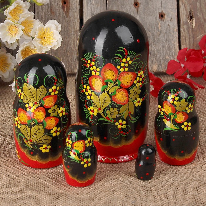 Матрёшка«Хохлома», чёрный платок, 5 кукольная, люкс