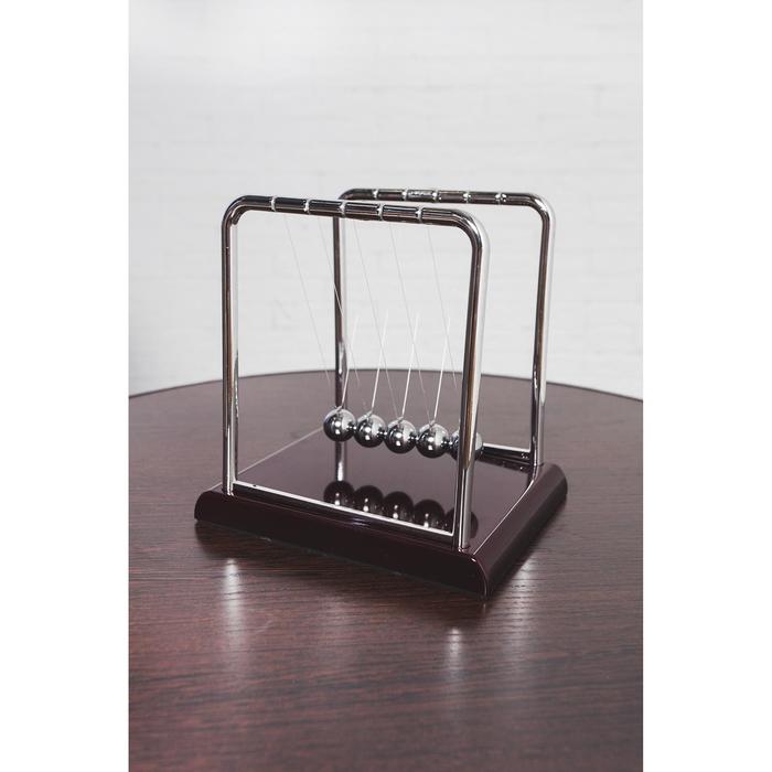 Маятник Ньютона на квадратной подставке бордовый, большой сегодня пользуется огромной популярностью у наших клиентов. Система состоит из подставки и пяти металлических шариков, которые подвешены на леске. Для активации маятника вам необходимо отвести один шарик в сторону и отпустить его. Затем наблюдайте, как шарики с противоположной стороны начинают двигаться в зеркальном отображении с той же скоростью. Через определенное время шарики останавливаются. Продолжительность движения зависит от размера и веса шариков: чем тяжелее и больше шарики, тем дольше процесс, и наоборот.