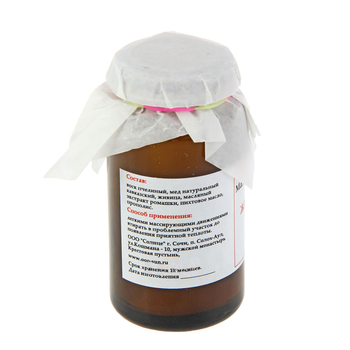 Состав: воск пчелиный, мёд натуральный кавказский, живица, масляный экстракт ромашки, пихтовое масло, прополис.