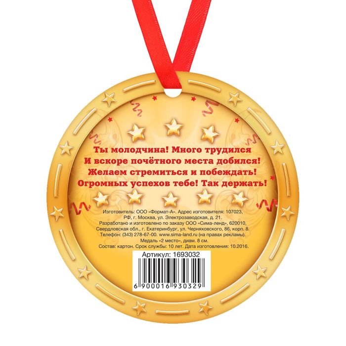 Невозможно представить нашу жизнь без праздников! Мы всегда ждём их и предвкушаем, обдумываем, как проведём памятный день, тщательно выбираем подарки и аксессуары, ведь именно они создают и поддерживают торжественный настрой. Медаль "2 место" — это отличный выбор, который привнесёт атмосферу праздника в ваш дом!