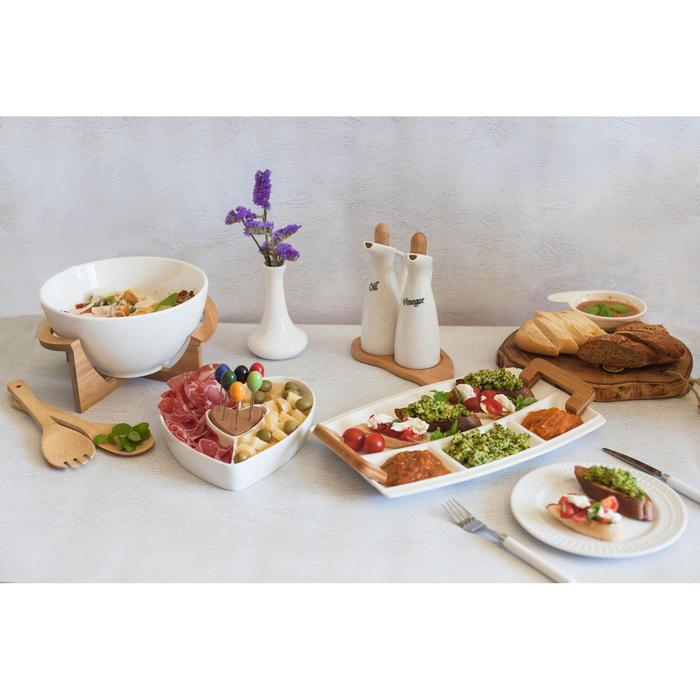 Менажница "Эстет", 2 секции, 6 шпажек в комплекте представляет собой основание, на котором располагаются две секции-пиалки. Такая конструкция будет смотреться уместно и за праздничным столом, и во время будничного обеда. В качестве бонуса в комплект входят 6 аккуратных шпажек на стильной бамбуковой подставке в центре менажницы.