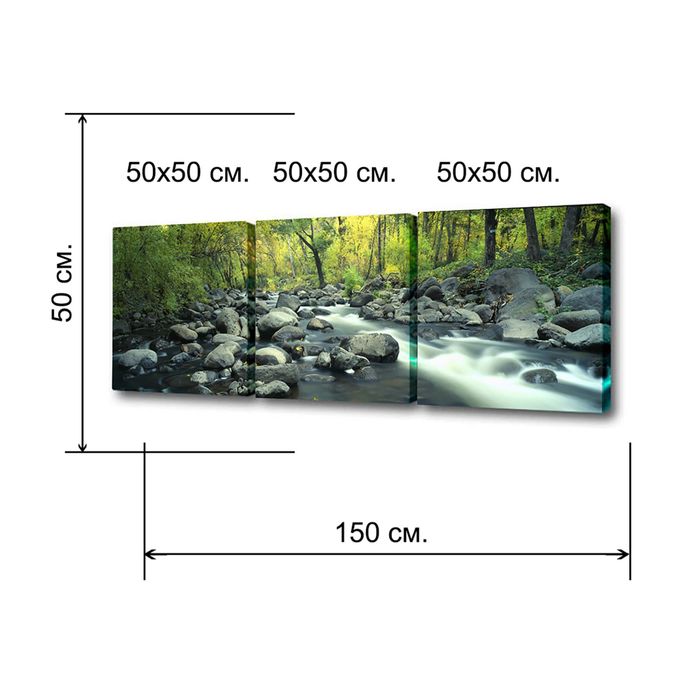 Изображение состоит из трех частей 50x50, 50x50 и 50х50 общий размер 150х50 см. Изображение напечатано на холсте. Холст натянут на деревянный подрамник. Крепеж в комплекте.