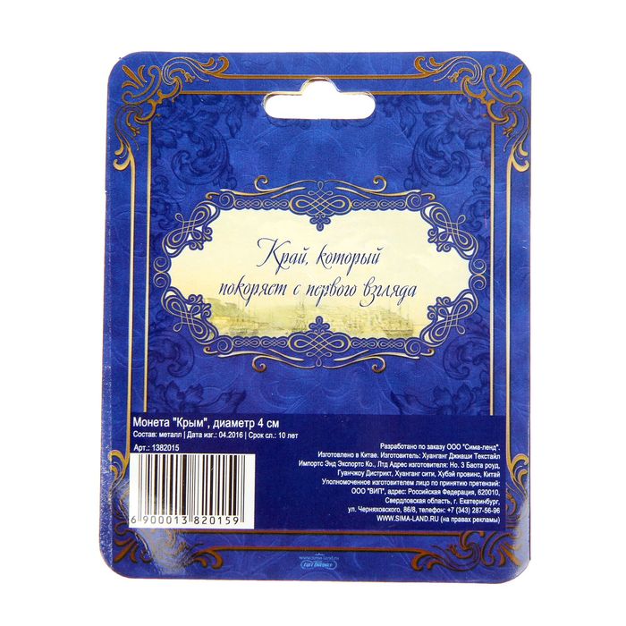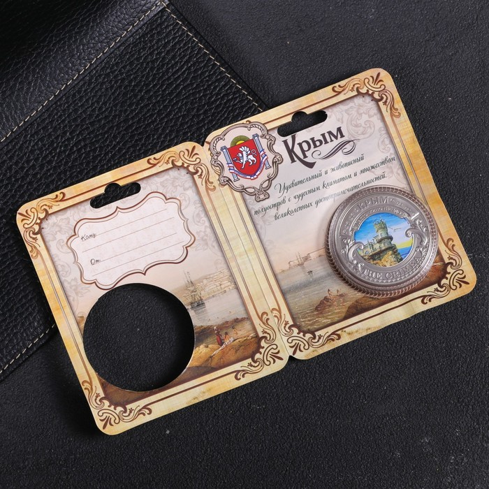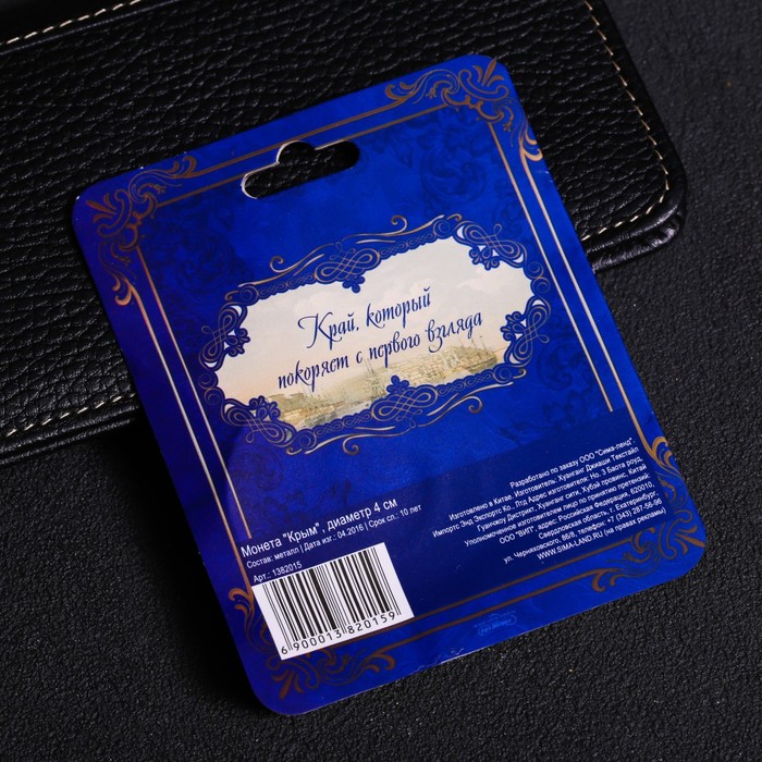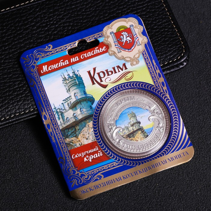 Счастливая монета-символ «Крым» изготовлена из металла с покрытием серебряного цвета. Изделие преподносится на подарочной подложке. Этот сувенир обязательно принесёт удачу своему обладателю. Положите монетку в кошелёк, и он никогда не опустеет, а везение будет сопутствовать денежным делам.