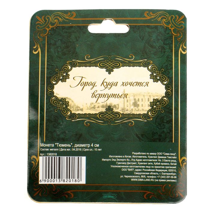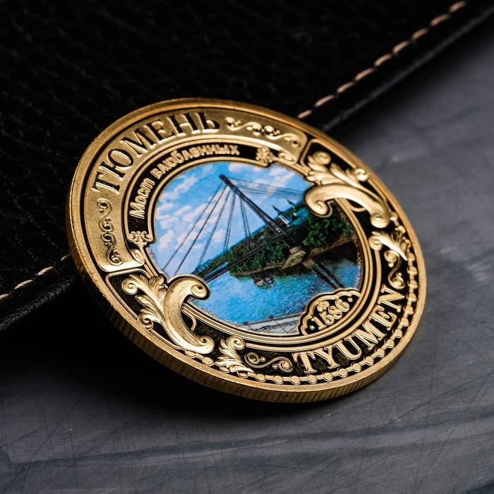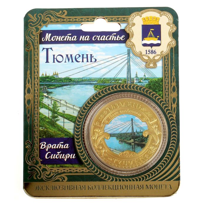 Счастливая монета-символ «Тюмень» изготовлена из металла с покрытием золотого цвета. Изделие преподносится на подарочной подложке. Этот сувенир обязательно принесёт удачу своему обладателю. Положите монетку в кошелёк, и он никогда не опустеет, а везение будет сопутствовать денежным делам.
