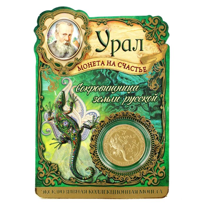 Счастливая монета-символ «Урал» изготовлена из металла с покрытием золотого цвета. Изделие преподносится на подарочной подложке. Этот сувенир обязательно принесёт удачу своему обладателю. Положите монетку в кошелёк, и он никогда не опустеет, а везение будет сопутствовать денежным делам.