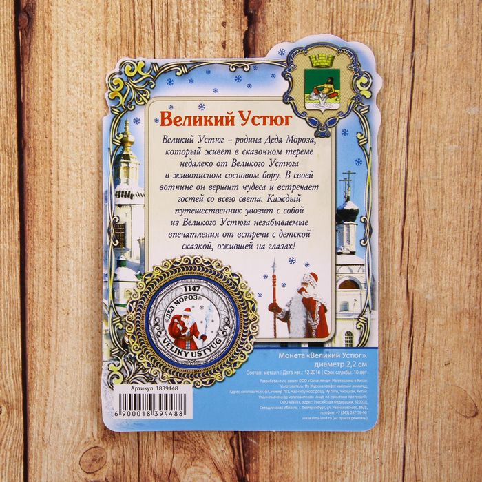 Монета «Великий Устюг», диам. 2,2 см — сувенир в полном смысле этого слова. И главная его задача — хранить воспоминание о месте, где вы побывали, или о том человеке, который подарил данный предмет. Преподнесите эту вещь своему другу, и она станет достойным украшением его дома.