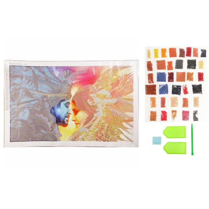 Снимайте защитный слой бумаги с холста, начиная с края картины. Аккуратно наклеивайте на открывшиеся участки стразы в соответствии с номерами на схеме. Для лучшей фиксации придавите изображение стеклом и закрепите в раме.