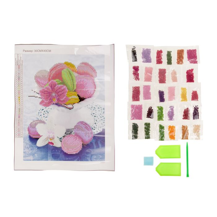 Снимайте защитный слой бумаги с холста, начиная с края картины. Аккуратно наклеивайте на открывшиеся участки стразы в соответствии с номерами на схеме. Для лучшей фиксации придавите изображение стеклом и закрепите в раме.