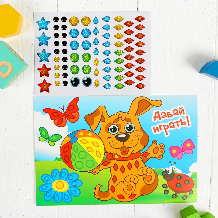 На основе расположена разноцветная картинка, изображающая жизнерадостных персонажей. Расположите на ней гелевые стразы разной формы в соответствии с контуром-подсказкой. Творить могут даже самые маленькие: клей и ножницы не понадобятся.