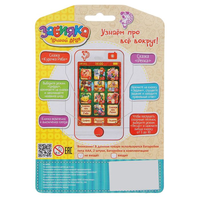 - Плеер работает в нескольких режимах: озвучивает цифры, рассказывает сказки, воспроизводит весёлые песенки и задаёт задачки.