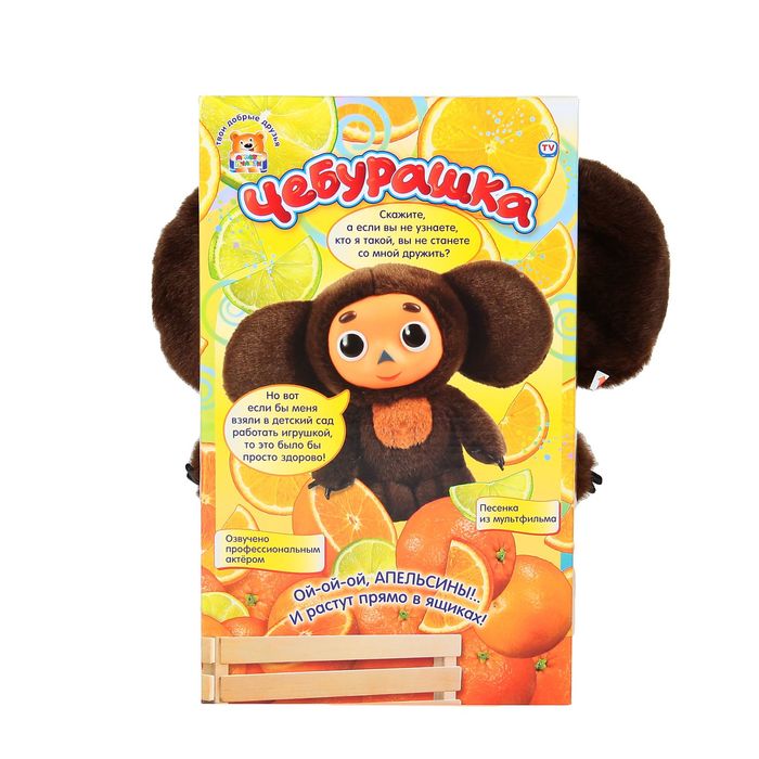 Чебурашка сделан из высококачественного пластика и искусственного меха, набит гипоаллергенным синтепоном, безопасным для здоровья ребёнка.