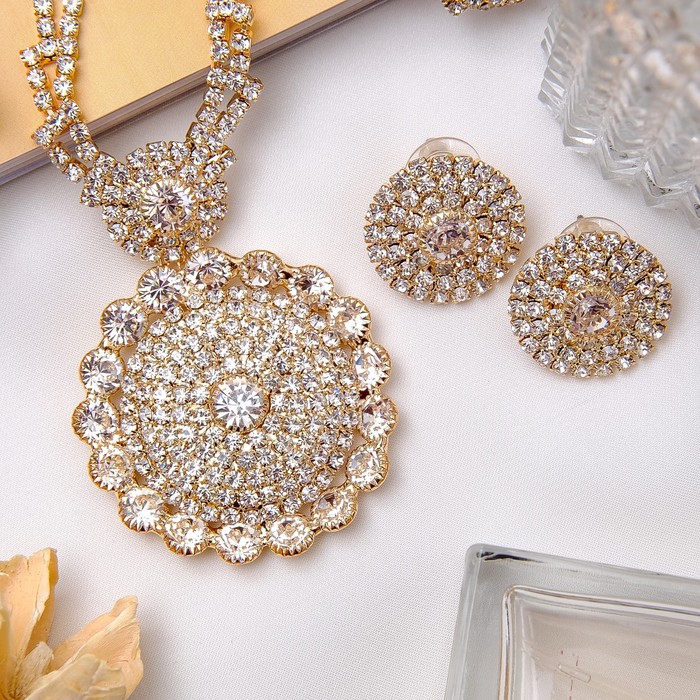 Ни один стиляга не будет выглядеть современно без искусно подобранных украшений, которые завершат его образ! Бижутерия — это современная недорогая альтернатива изделиям из золота и прочих драгоценных металлов. Набор 2 предмета: серьги, колье "Искры вечера" круг, цвет белый в золоте — это то, что добавит вам шарма!