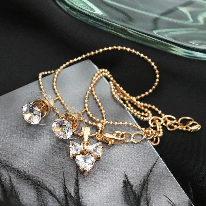 Ни один стиляга не будет выглядеть современно без искусно подобранных украшений, которые завершат его образ! Бижутерия — это современная недорогая альтернатива изделиям из золота и прочих драгоценных металлов. Набор 2 предмета: серьги, кулон "Луна" циркон, бант, в коробочке, цвет белый в золоте — это то, что добавит вам шарма!