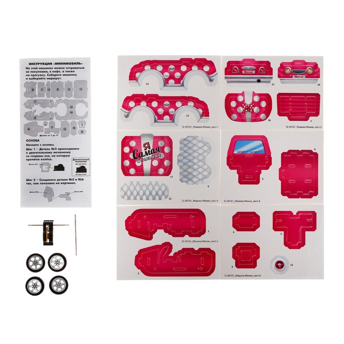 Всё, что вам понадобится, — это ваши умелые ручки и хорошее настроение. Детали для сборки легко выдавливаются из картона, достаточно соединить их между собой и установить на двигательный механизм — «Машина Минни» готова начать движение.