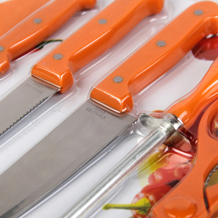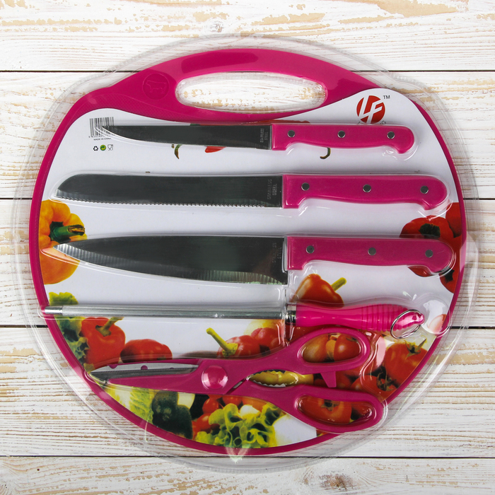 От качества посуды зависит не только вкус еды, но и здоровье человека. Набор 6 предметов: 3 ножа 12,5/16,5/17,5 см, мусат, ножницы, доска 33х31,5 см , цвета МИКС — товар, соответствующий российским стандартам качества. Любой хозяйке будет приятно держать его в руках. С нашей посудой и кухонной утварью приготовление еды и сервировка стола превратятся в настоящий праздник.