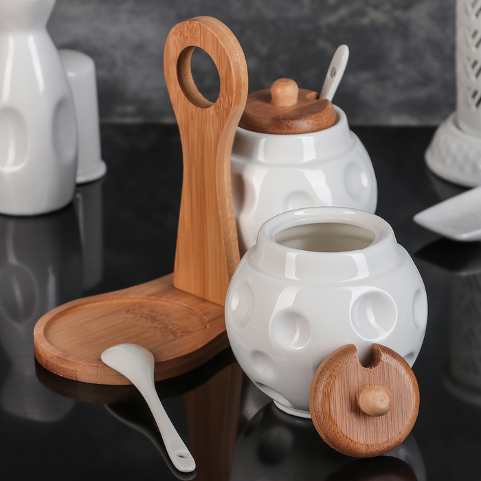 Набор банок для сыпучих продуктов 250 мл "Эстет. Овал", 2 ложки, на деревянной подставке
