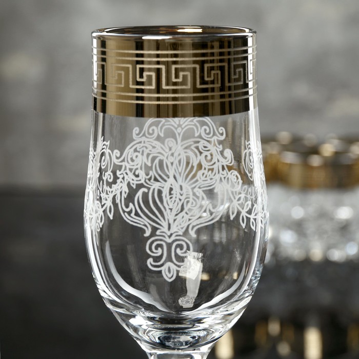 Набор бокалов — выбор ценителей изысканного стиля. Тонкое стекло покрыто нитрид-титановым напылением золотистого цвета, за счёт чего все предметы выглядят оригинально и стильно. Дополняет внешний вид механическая гравировка.