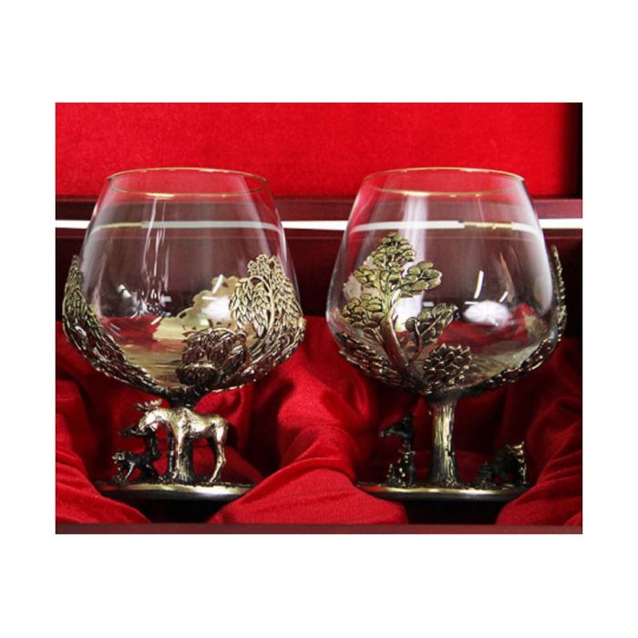 Набор бокалов для коньяка «Охота на лося и охота на медведя» в деревянной шкатулке