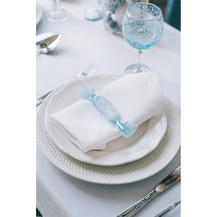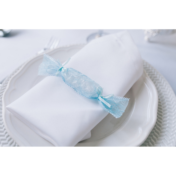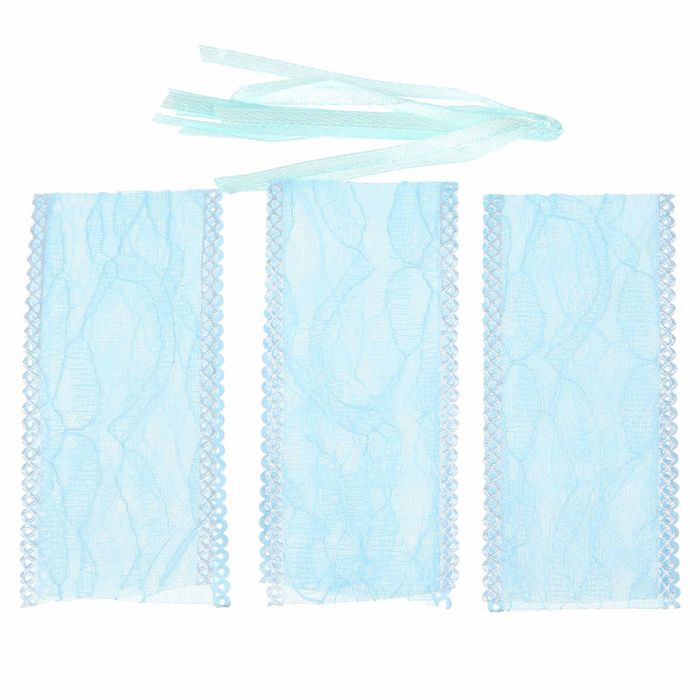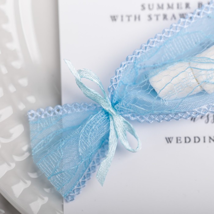 Набор свадебных бонбоньерок «Сладкий комплимент» из кружева голубого цвета не только сделает приятное гостям, но и украсит праздничный стол. В ажурные полоски нужно положить сладости и связать их края с помощью ленточек, которые входят в набор. Готово! Поставьте подарочки возле бокалов или на тарелки.