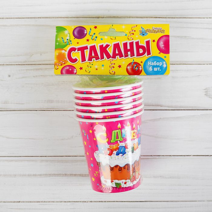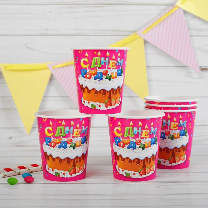 Набор бумажных стаканов "С Днём Рождения", тортик, 250 мл, 6 шт.