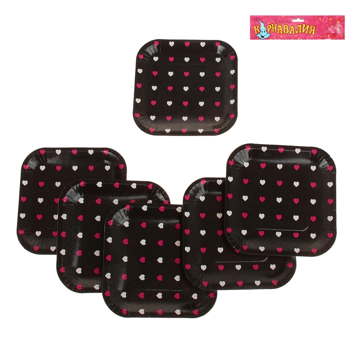 Набор бумажных тарелок "Цветные сердечки" черный цвет, (6 шт), 18 см