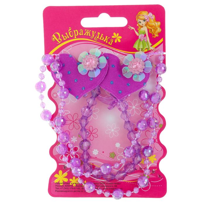 Набор детский "Выбражулька" 5 предметов: 2 резинки, бусы, браслет, кольцо, сердечки, цвет фиолетовый