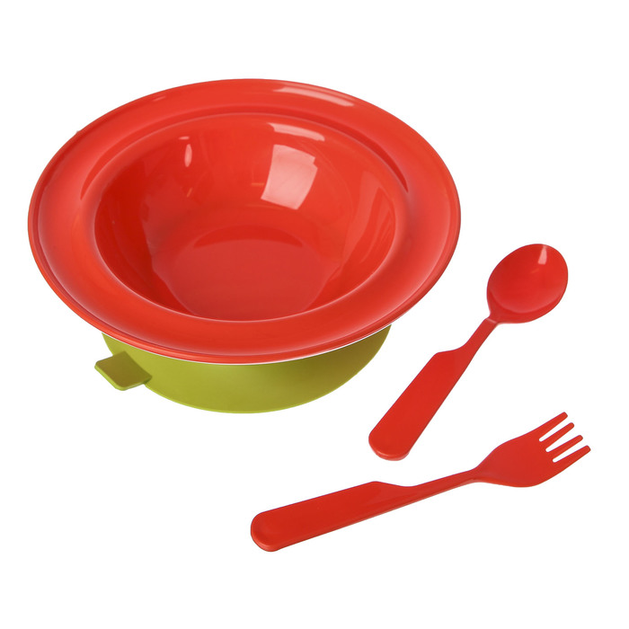 Набор детской посуды, 3 предмета: тарелка на присоске 280 мл, ложка, вилка, от 6 мес., цвет красный МИКС