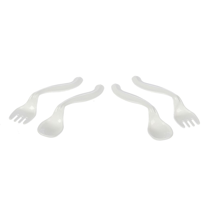 Присоска надёжно зафиксирует тарелочку на столе или подносе. Она не перевернётся, даже если малыш увлечётся игрой и случайно толкнёт миску. Края у ложечек и вилочек закруглены, ручки имеют изогнутую форму, удобную для детской ладошки.