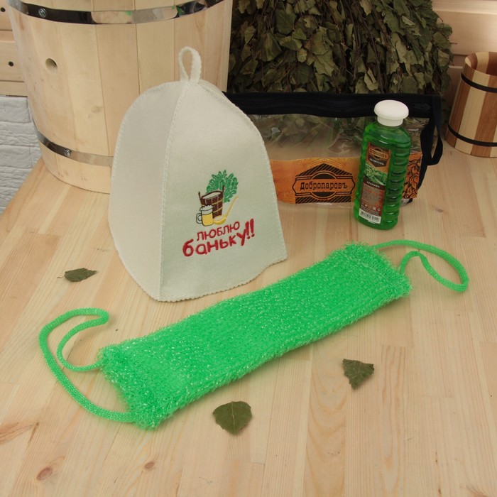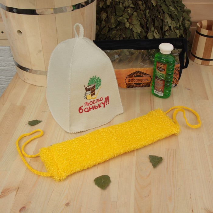 Набор для бани в косметичке "Люблю баньку" шапка, шампунь, мочалка