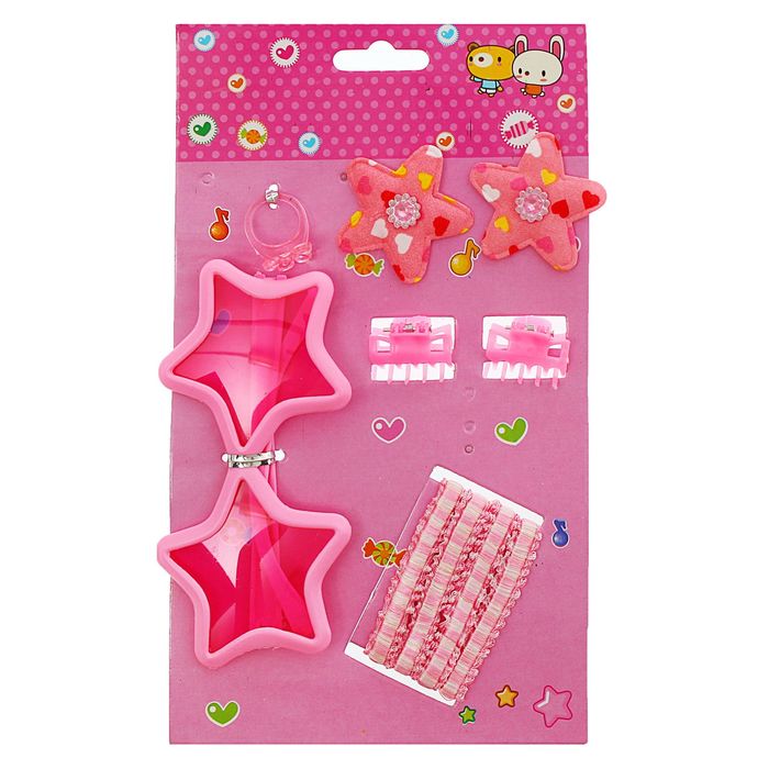 О чём мечтает каждая маленькая принцесса? Конечно быть самой красивой и похожей на маму. Набор для девочки "Звёздочка", 10 предметов: кольцо, очки, 2 краба, 6 резинок поможет ей создать стильный образ.