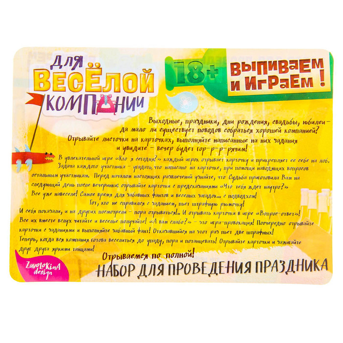 Чтобы торжество прошло на ура мы создали набор для проведения праздника "Для веселой компании"! Он состоит из подложки с мини-сценарием и 8 карточек с отрывными заданиями. По порядку выполняйте их и находите ответы на загадки вместе с гостями. Отличное настроение гарантировано!