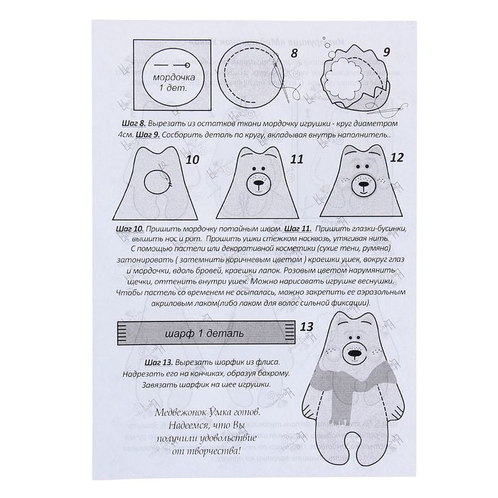Может быть, именно такой необычный товар, как Набор для шитья текстильной игрушки "Медвежонок Умка", раскроет неожиданные способности у вашего ребёнка. И даже если он не станет новым Рафаэлем, то ему, определённо, обеспечена богатая фантазия, креативное мышление и золотые руки.