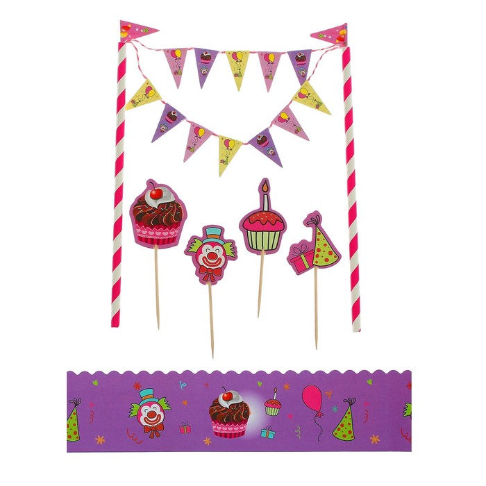 Набор для торта "Веселая вкусняшка" 1 гирлянда, пики 4 шт. лента для торта 1 шт.100 см (д. 30 см)