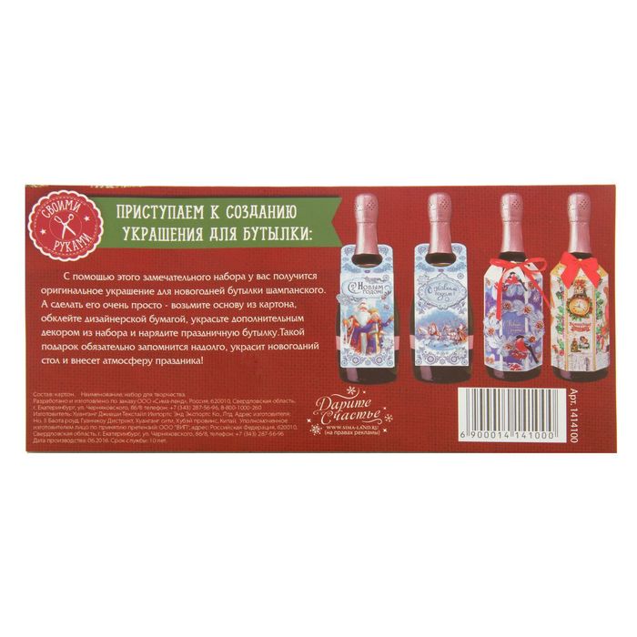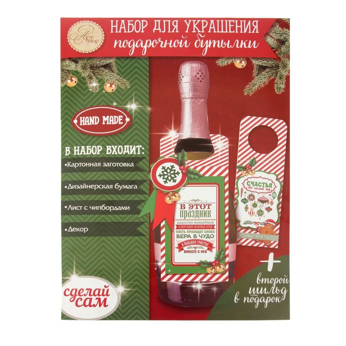 С помощью этого замечательного набора у вас получится оригинальное украшение для бутылки шампанского! Изготовление такого декора займёт у вас совсем немного времени. Этот подарок обязательно запомнится надолго, украсит новогодний стол и дополнит атмосферу праздника!