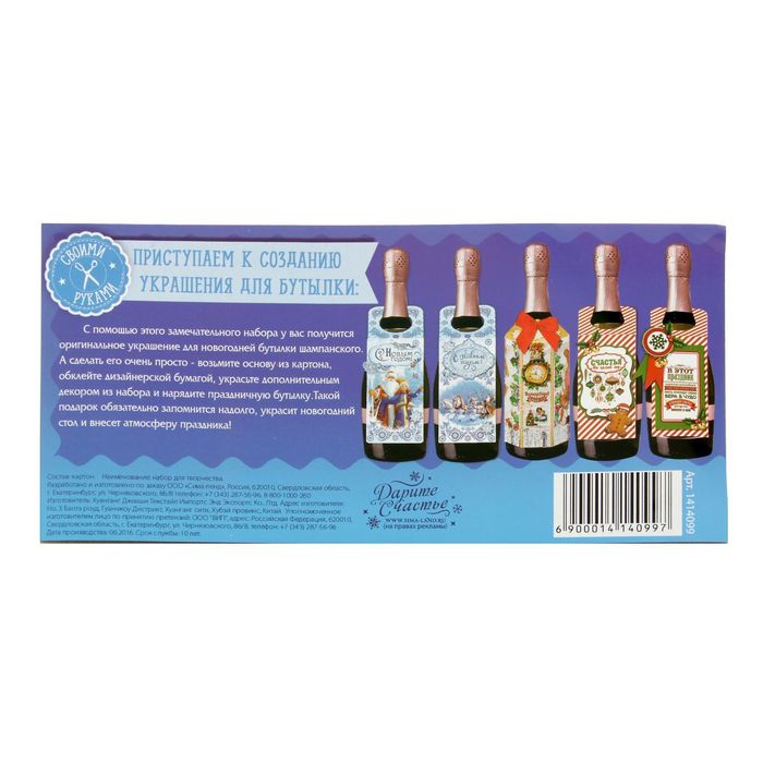 С помощью этого замечательного набора у вас получится оригинальное украшение для бутылки шампанского! Изготовление такого декора займёт у вас совсем немного времени. Этот подарок обязательно запомнится надолго, украсит новогодний стол и дополнит атмосферу праздника!
