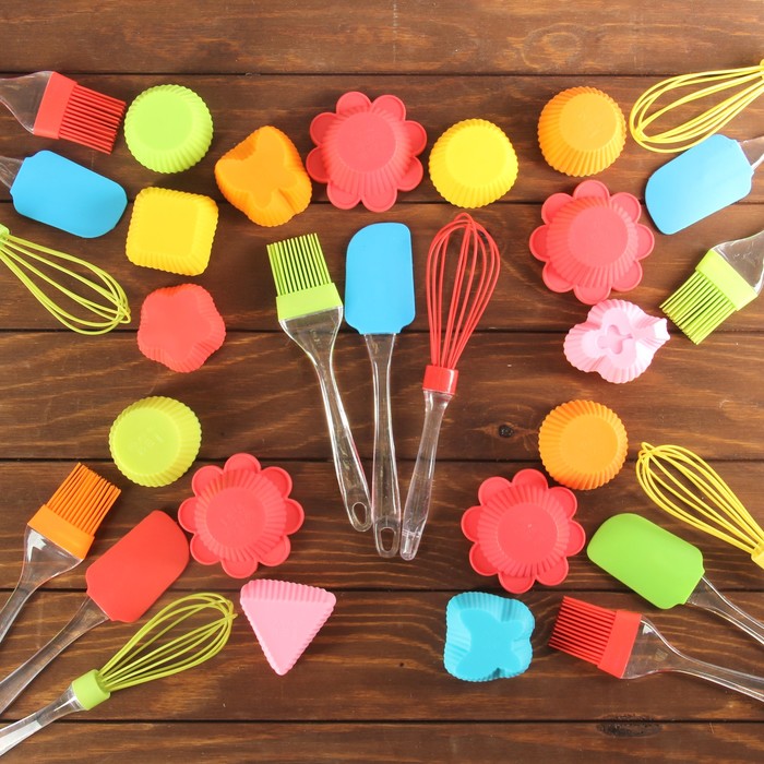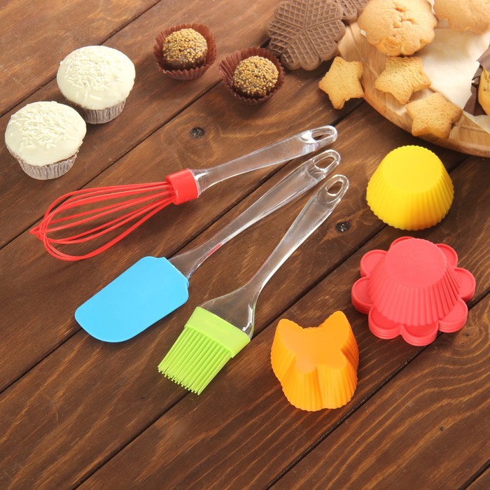 Силиконовые формы для выпечки полюбились многим хозяйкам за свою эластичность и долговечность. В набор «Риб» входят сразу 9 фигурных ёмкостей, а ещё: удобный венчик, кисть и лопатка, безопасные для антипригарных покрытий.