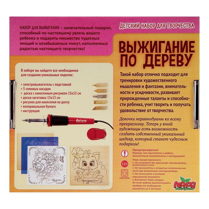 Комплект создан для тех ребятишек, кто ещё не научился самостоятельно придумывать сюжеты, но уже уверенно держит в руках прибор для выжигания. С его помощью малыш легко создаст настоящее произведение искусства на простом кусочке дерева.