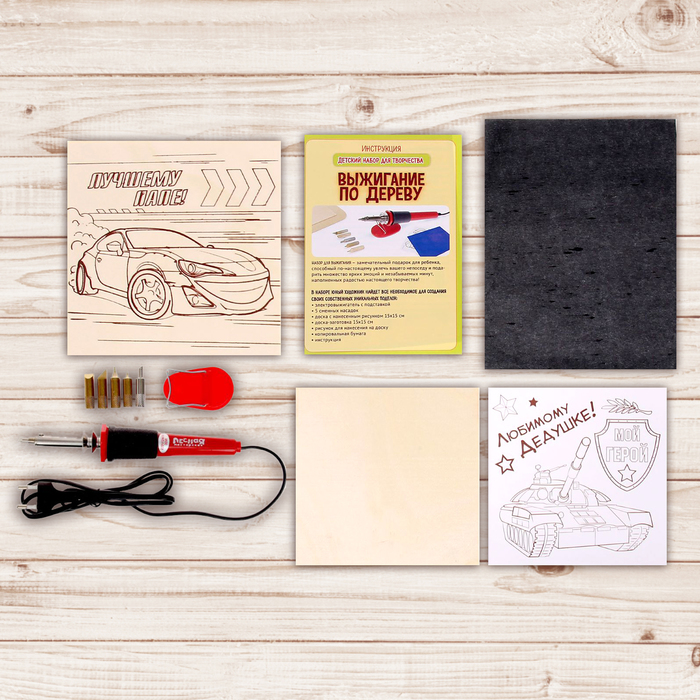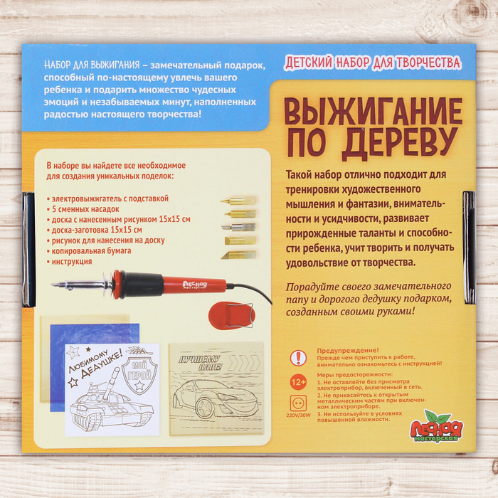 Комплект создан для тех ребятишек, кто ещё не научился самостоятельно придумывать сюжеты, но уже уверенно держит в руках прибор для выжигания. С его помощью малыш легко создаст настоящее произведение искусства на простом кусочке дерева.