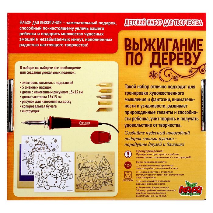 С помощью этой занимательной техники вы сможете украсить к Новому году любой деревянный предмет, будь то фоторамка, шкатулка для украшений или дедушкино кресло-качалка. Создайте шедевр своими руками и подарите его родным! В набор входит доска с праздничным рисунком и чистая заготовка, на которой можно самостоятельно изобразить картину или перевести рисунок с помощью копировальной бумаги.
